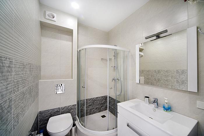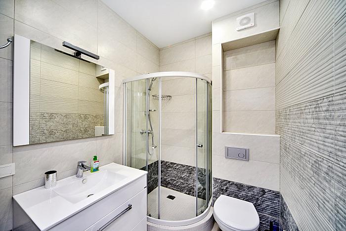 Ванная комната: душевой кабина с гигиеническим душем; унитаз; умывальник; зеркальный шкаф с подсветкой; косметическое зеркало; фен.