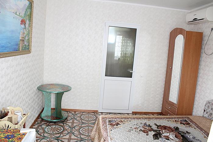 В комнате — 2 односпалки или 2х спальная кровать/по желанию/ платяной шкаф, столик, этажерка с набором посуды, холодильником и кондиционером