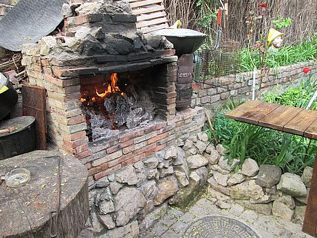 В тихом, утопающем в цветах дворике под навесом веранды столики для отдыха и приема пищи, мангал, барбекю.
