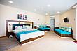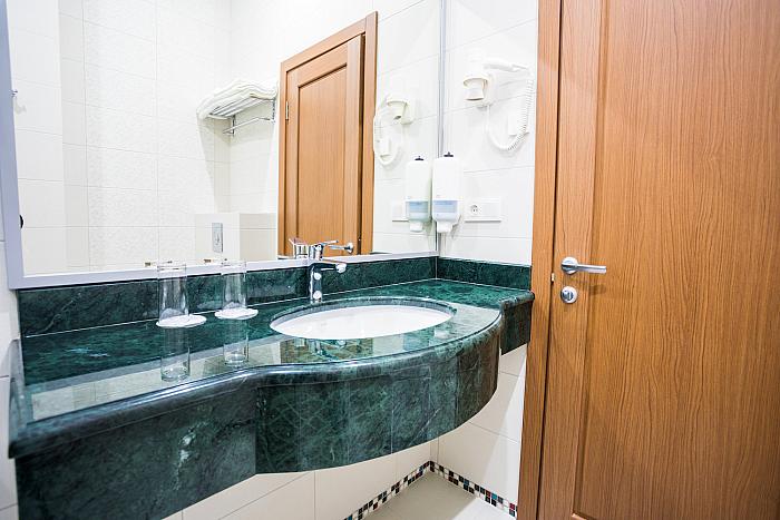 В номере: двуспальная кровать, прикроватные тумбочки, 2 тахты, шкаф-купе, стол, стулья, вешалка, зеркало, кондиционер, теплые полы (зимой), сейф, телевизор ЖК, мини-холодильник, чайник, набор посуды, микроволновая печь, пляжные полотенца, санузел с душевой кабиной, фен, туалетные принадлежности, тапочки, балкона нет, вид из номера во двор, wi-fi,