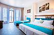 В номере: двуспальная кровать, прикроватные тумбочки, кресло-кровать, шкаф-купе, стол, стулья, вешалка, зеркало, кондиционер, теплые полы (зимой), сейф, телевизор ЖК, мини-холодильник, чайник, набор посуды, микроволновая печь, пляжные полотенца, санузел с душевой кабиной, фен, туалетные принадлежности, тапочки, балкона нет, вид из номера на море и город, wi-fi.