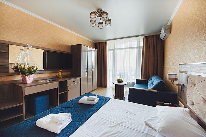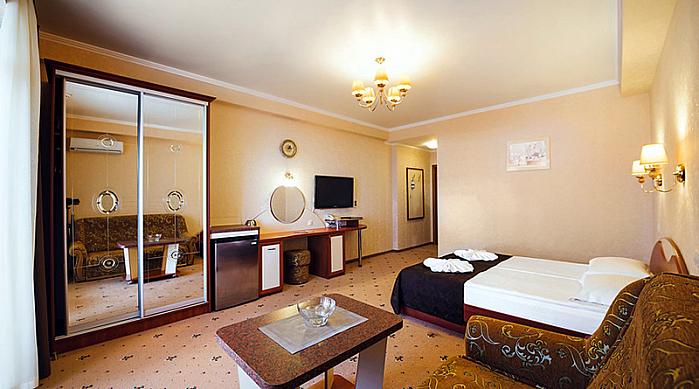 В каждой из комнат (спальне и гостиной) размещены: кондиционер, плазменная панель со спутниковым телевидением, индивидуальный санузел с итальянской сантехникой, душ с мини-сауной, из каждой комнаты есть отдельный выход на балкон-террасу с прекрасным видом на море. На балконе расположен столик для 4-х человек. Номер оборудован холодильником, электрочайником, кулером с водой, набором посуды, сейфом. Номер категории «Люкс» предназначен для проживания от 1-го до 4-х человек (2 основных и 2 дополнительных места).