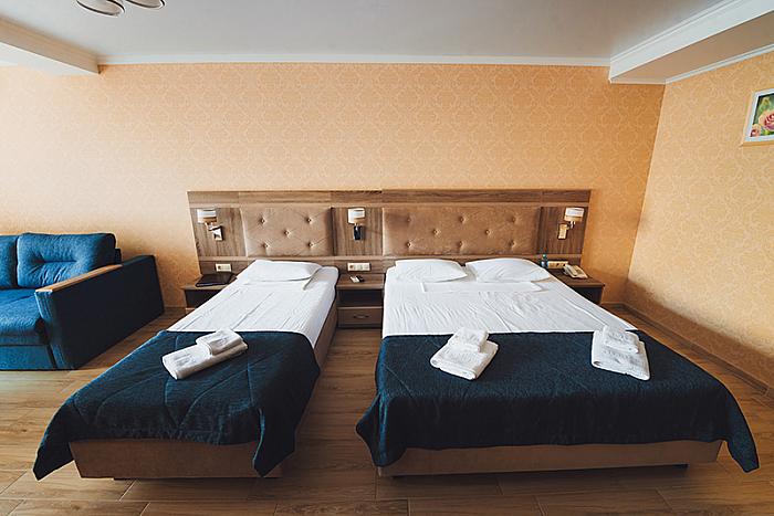 Номер рассчитан на проживание от одного до четырех человек (два основных и два дополнительных места). Размещение одного ребенка до шести лет не оплачивается.