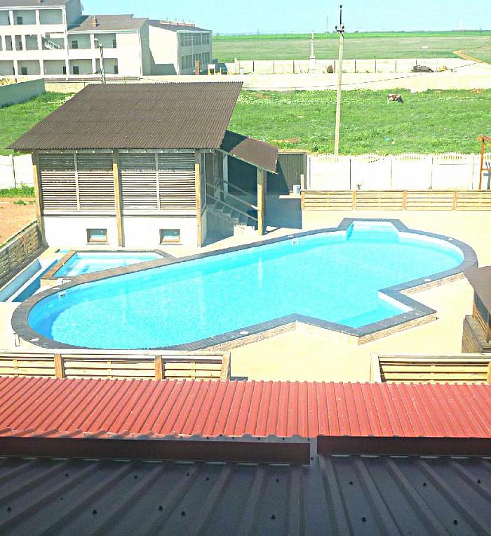На просторной, благоустроенной внутренней территории, надёжно закрытой от посторонних глаз вы сможете загорать в шезлонгах перед большим открытым бассейном.