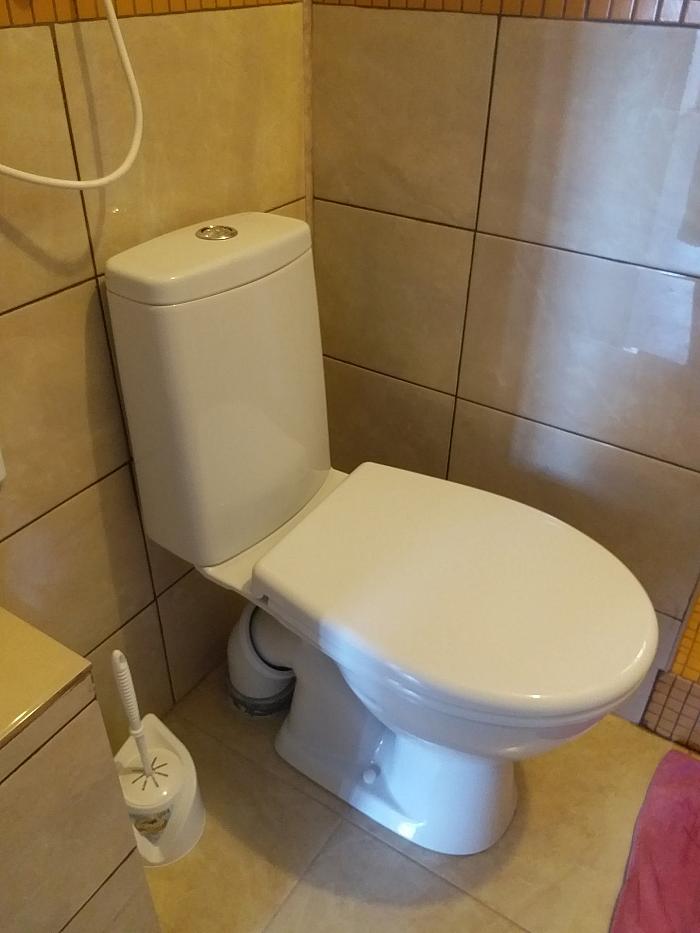 В углу Ванной комнаты рассположен унитаз и нагревательный бак для воды.