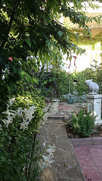 Участок хорошо озеленен, много цветов, плодоносящие фруктовые деревья. Заборы и дом увиты зеленью.