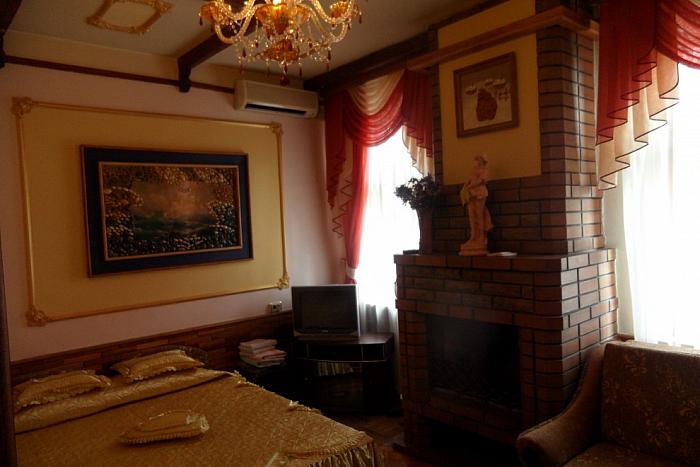 Трехкомнатный люкс на 6-9 человек, камин, санузел с феном и душем, 2 дивана, 3 двухспальные кровати, 2 кондиционера, холодильник, 2 телевизора, посуда, чайник.