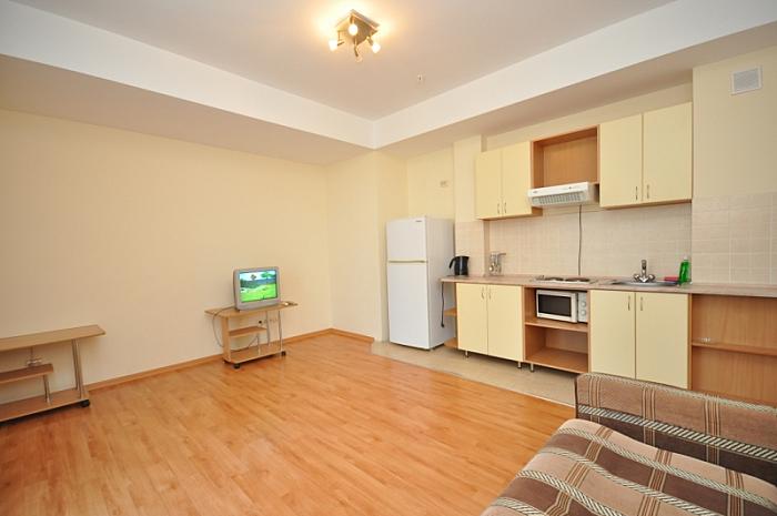 гостиная-студия в которой находится укомплектованная всем необходимым для приготовления еды кухня (в том числе варочная поверхность, микроволновая печь, мойка, холодильник, а также посуда и кухонные принадлежности), журнальный столик, раскладной диван на 2 персоны, спутниковое ТВ;